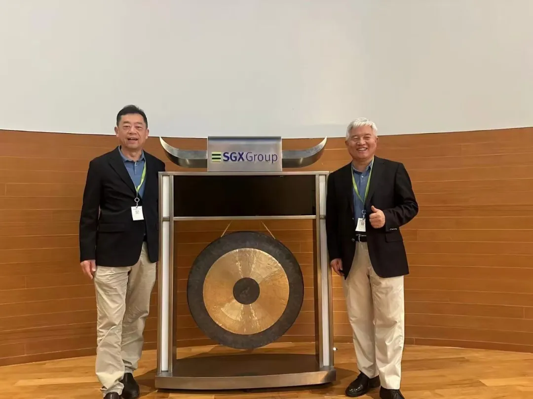 与张维迎老师(右)在SGX新加坡交易所狮头铜锣开市处合影